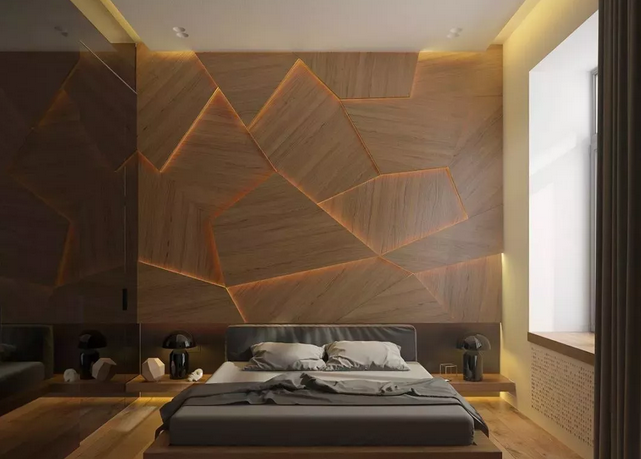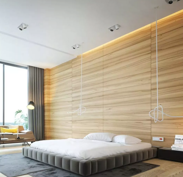 近年來北歐、日式風格逐漸盛行,原木也開始成為設(shè)計上的主打材質(zhì), 用木飾面代替相框、裝飾畫來進行臥室裝扮,新意十足。