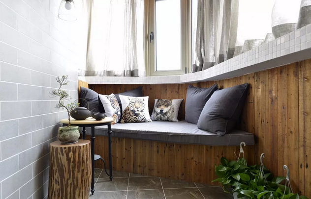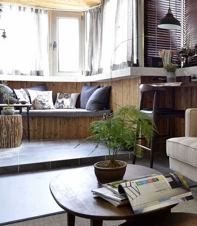 曲線環(huán)繞形的窗戶區(qū)域,簡(jiǎn)直是家里光源的主要功勞者,木質(zhì)天花與下方木質(zhì)墻面相呼應(yīng),統(tǒng)一性與整體性讓人在這個(gè)空間中,很舒服,還有空間分割做了小臺(tái)階,
