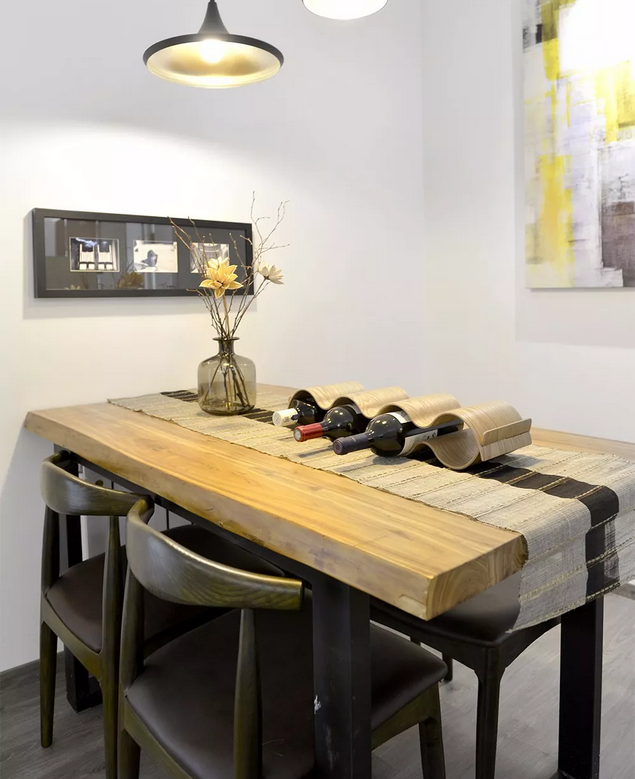 空間利用的剛剛好,實(shí)木的餐桌和餐椅,很有質(zhì)感,與客廳的書香氣也很搭,餐廳與客廳的隔斷,前面也提到了,這里細(xì)說一下,小隔斷不擋光,仿水泥材質(zhì)兼具質(zhì)感與美感。
