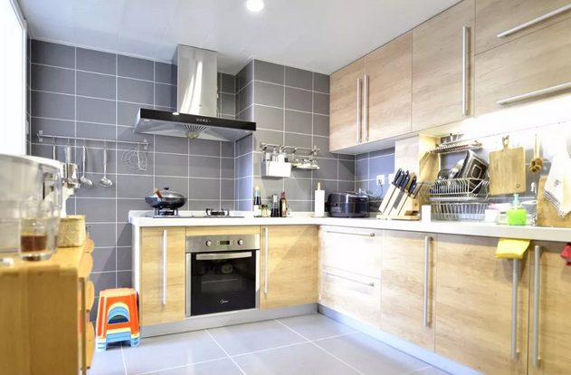 灰色與原木色配搭的廚房廚房的原木色與灰色搭配,定制櫥柜,收納能力驚人,還有一旁的邊柜,放置了料理機(jī),杯子等,取用十分方便,