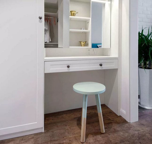 利用主臥富裕的面積加出來(lái)的衣帽間兼梳妝區(qū),有單獨(dú)的燈光照亮梳妝區(qū)。請(qǐng)不要問(wèn)我梳妝臺(tái)的鏡柜門正好中間那塊沒(méi)有怎么照,其實(shí)那塊壞了拿去維修了……