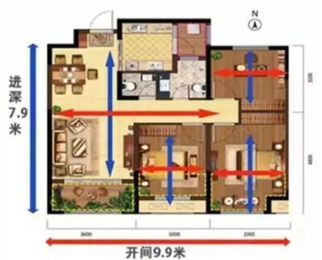 把房子的主要采光面稱為開間(一般指東西的距離),與其垂直的稱為進(jìn)深(一般指南北的距離)。開間和進(jìn)深的比例為4:6較為合適,如果開間太小,進(jìn)深過大,會影響房子的采光,反之則室內(nèi)溫度,濕度不穩(wěn)。