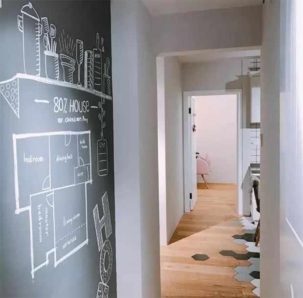 如果家里有小孩的情況,不妨把走廊的大白墻改成黑板墻,給小孩一個涂涂畫畫的小空間。有了黑板墻,再也不用擔心大白墻被涂花了。相比大白墻,黑板墻的裝飾效果充滿童趣。