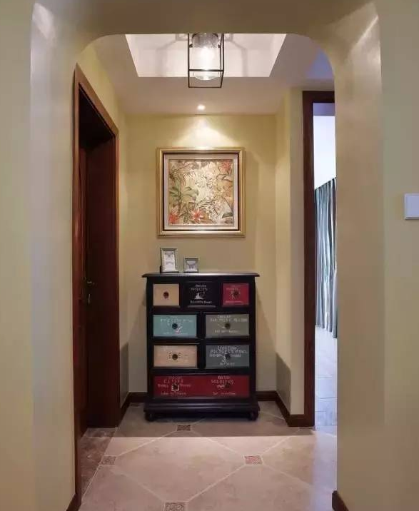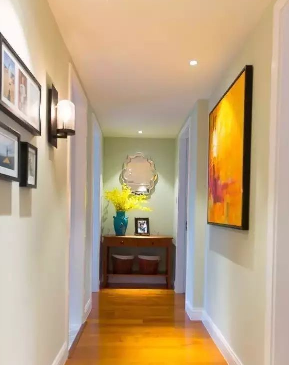 也可以選擇掛上一些自己喜歡的藝術畫布置走廊墻壁。配合燈光作用,走廊也能變成家里的一道亮麗的風景。