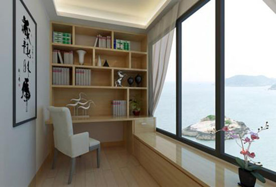 房子面積小,一般都不設(shè)有獨(dú)自的書房或工作間,其實(shí)稍加改造,調(diào)配全體書櫥、寫字臺、伸縮式吊燈、休閑椅就能將陽臺“裝扮”成一間獨(dú)具匠心的雅致書房。既可在此與友人敘談,書寫疲倦時仍是擴(kuò)展軀體、放松神經(jīng)的氧源豐厚的歇息之地。
