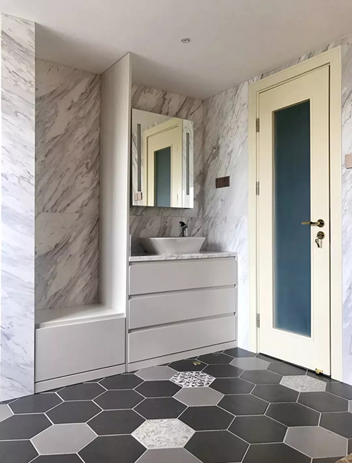 利用花磚給空間分區(qū),是效果最柔和也最能營造空間層次感的做法,一般使用于衛(wèi)浴間、廚房。