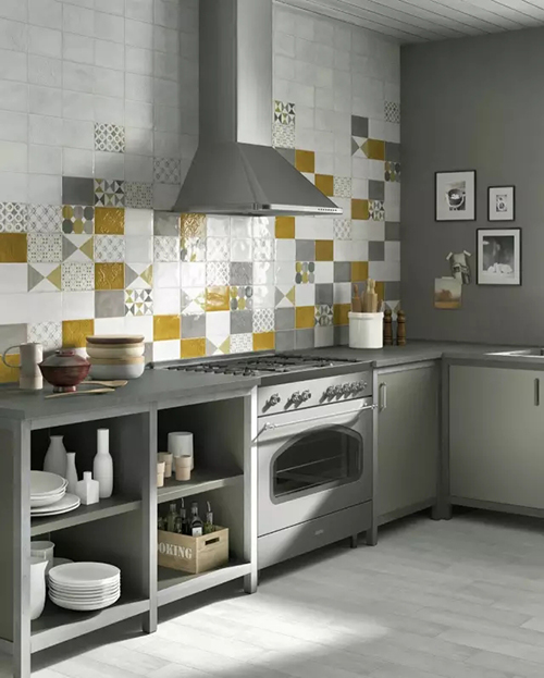 這種方法需要一定的設(shè)計功底,或者參考一些精美的空間圖片進(jìn)行布局,不然會讓空間顯得凌亂無章。多用于廚房、衛(wèi)浴間。