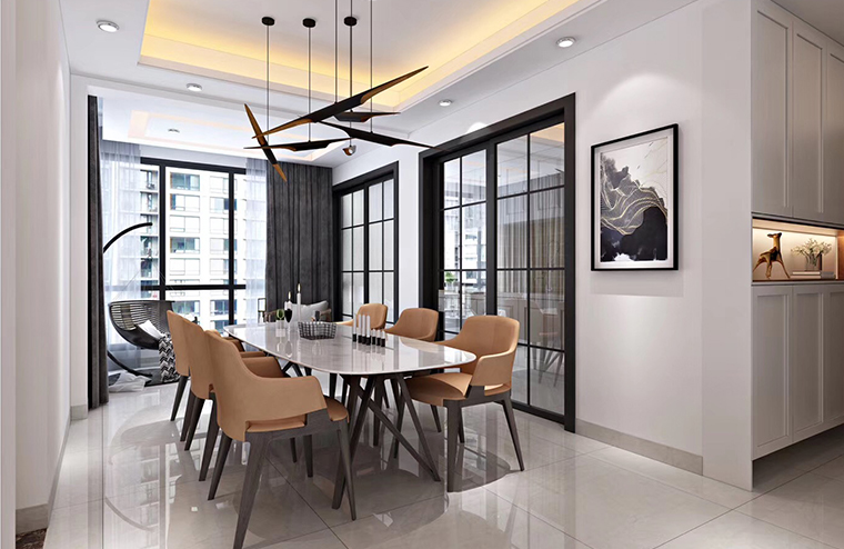 對(duì)于采光不好的餐廳來講,如果只是利用光源設(shè)計(jì)來進(jìn)行調(diào)整與改變,要知道餐廳裝修過程中本來就是忌諱使用大量的光源,這會(huì)使人們?cè)诰筒蜁r(shí)感到非常不舒服,而采用現(xiàn)代簡(jiǎn)約的裝修風(fēng)格,就算只是在一盞水晶吊頂的搭配下,也會(huì)令餐廳的光線十足,如圖,采用不吊頂?shù)暮?jiǎn)裝,但是天花板以淺色系的白色主打,配以淺色的地板,會(huì)令整個(gè)空間顯得簡(jiǎn)約而明亮,搭配以淺咖啡色的餐廳背景墻裝修,又令整個(gè)餐廳空間不那么單調(diào)與空洞。