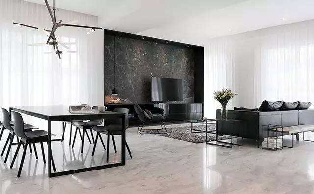 ▲黑白拼色花紋的地毯搭配圓形的玻璃茶幾,為我們展示了同種材質(zhì)的多種美感。