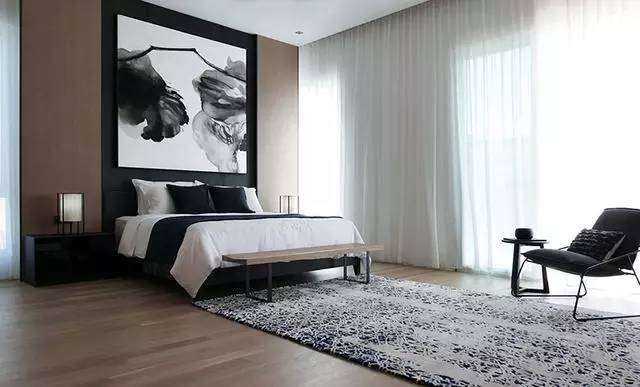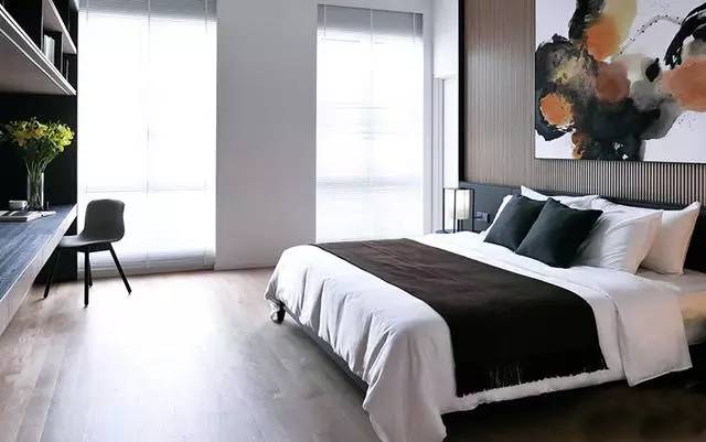 ▲床頭背景墻也被設(shè)計(jì)成木質(zhì)的,搭配衣服黑白的水墨畫(huà)后,別有一番意境。