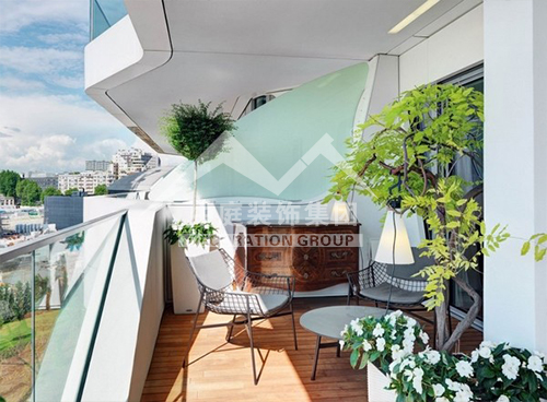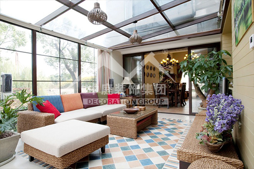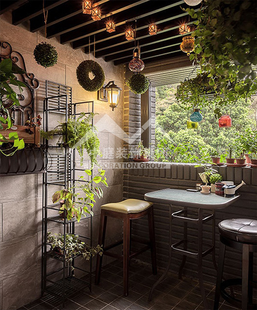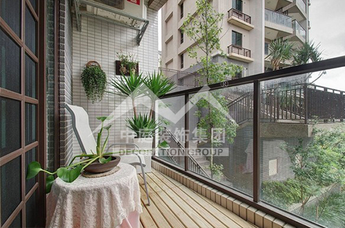 如果是陽臺面積較大又位于頂樓,應(yīng)該屬于“露臺”??稍陉柵_上加透明的弧形采光頂,就可使陽臺當(dāng)作房間使用。陽光通過采光板灑向用文化石做的墻壁,以及青石板鋪成的地面,而且也照亮了“人”字型的鵝卵石小徑……這些園林造景手法,用在陽臺上,會給人濃濃的休閑氣息。