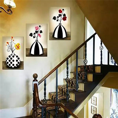 走廊和樓梯空間很容易被人忽略掉,但其實(shí)這些空間非常重要,而類(lèi)似這種狹長(zhǎng)空間,可以選擇同主題的組合畫(huà)。樓梯懸掛時(shí)可以高低錯(cuò)落,順勢(shì)而掛。