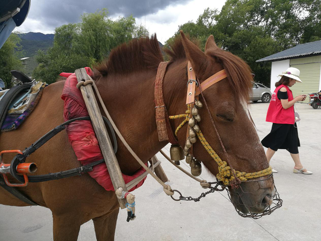 一家人坐在馬車(chē)上,享受著束河古鎮(zhèn)的寧?kù)o。