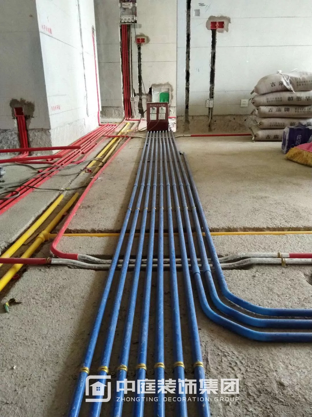 施工現(xiàn)場(chǎng)線管鋪設(shè)橫平豎直,按照集團(tuán)施工規(guī)定使用鐵皮卡扣固定,管和管之間留有足夠縫隙,以便鋪設(shè)地磚時(shí)水泥砂漿進(jìn)入管下,避免地磚后期出現(xiàn)空鼓;