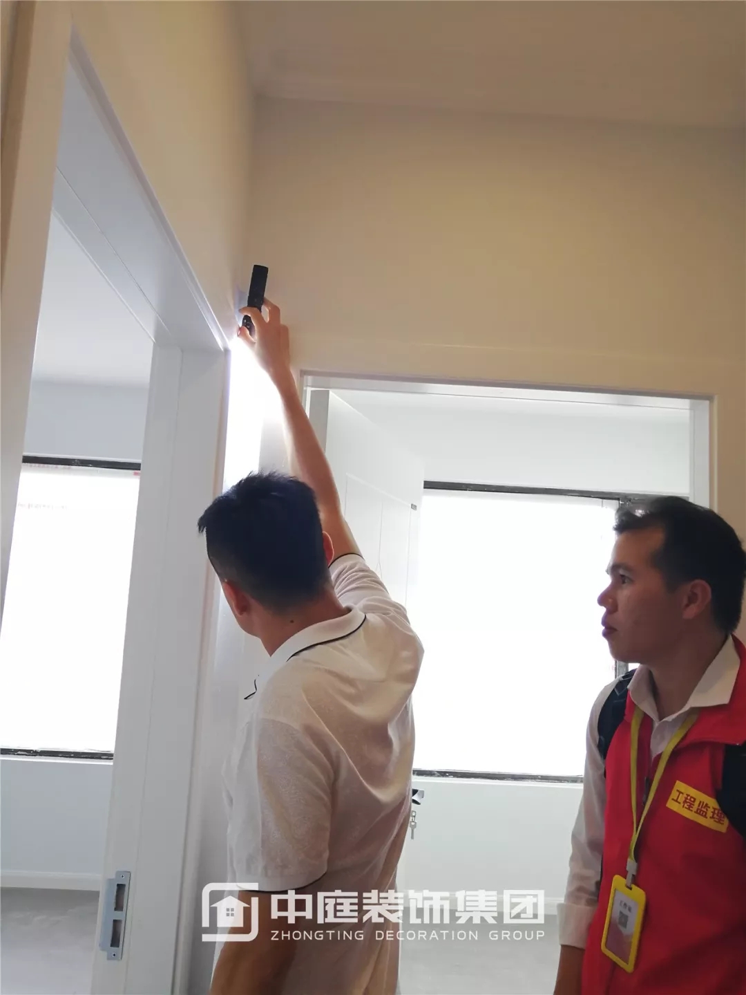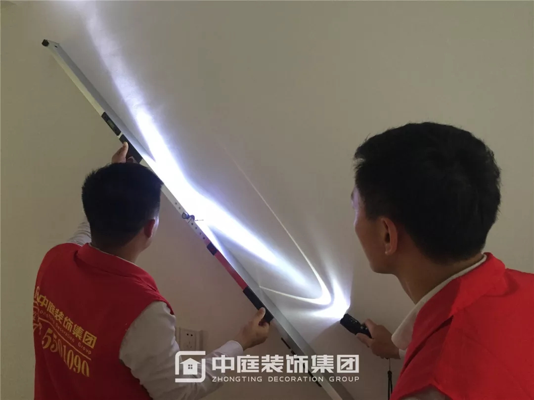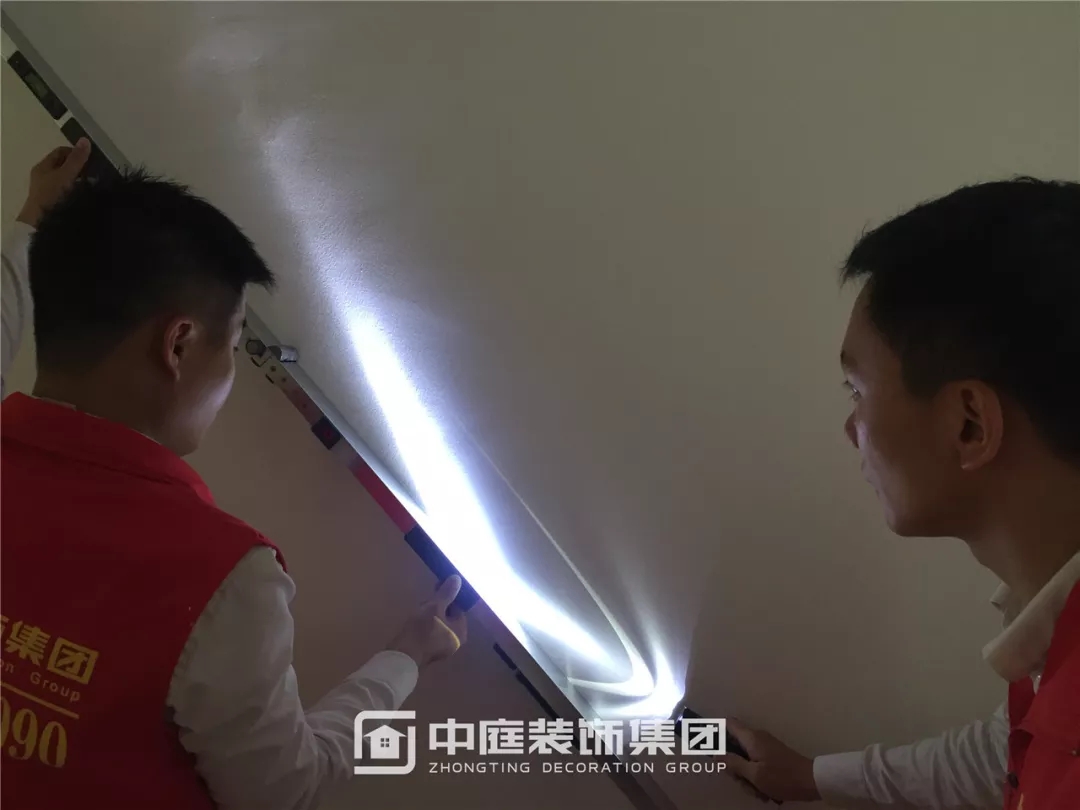 強(qiáng)光光線無法穿透靠尺并產(chǎn)生折射,墻面平整度達(dá)標(biāo)。