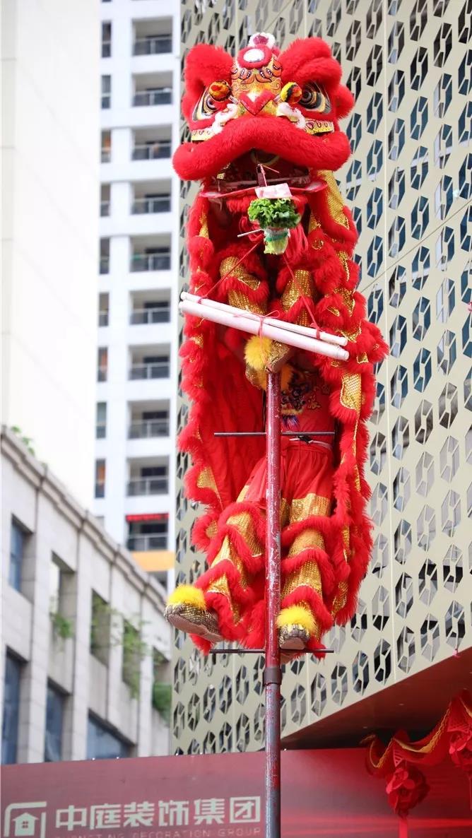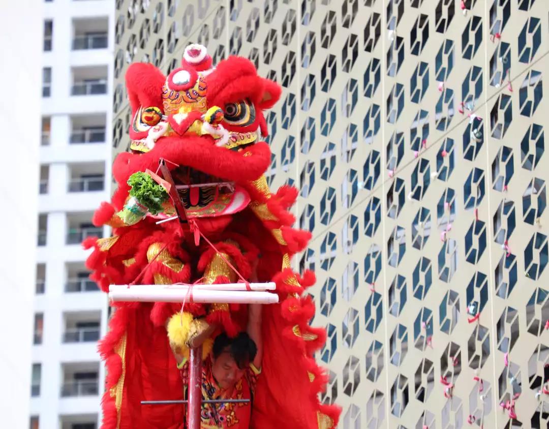 激揚(yáng)的鼓樂陣陣響起,象征著吉祥和財(cái)富的雄獅迅猛登高,見青、喜青、望青、探青、采青。