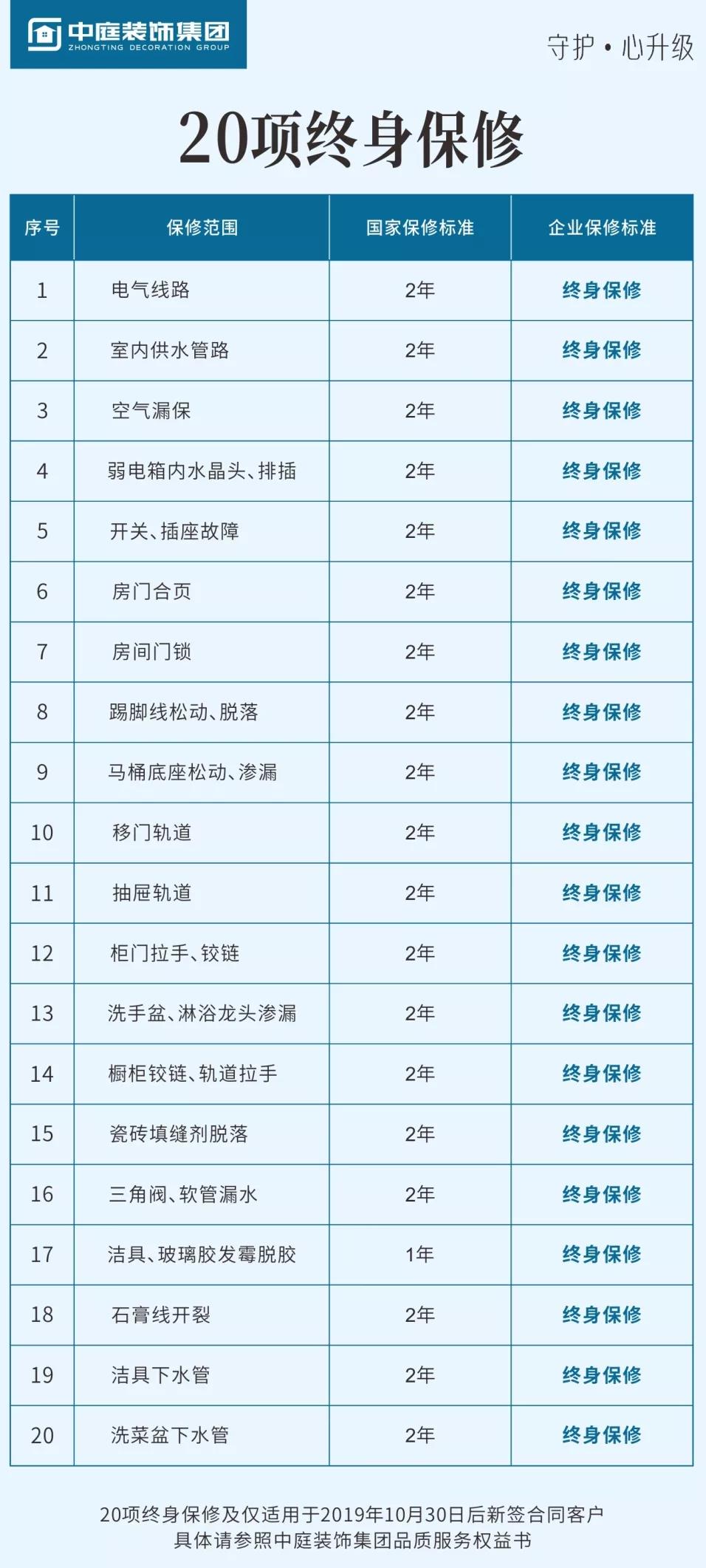 中庭裝飾集團(tuán)20項(xiàng)終身保修上線,按照國(guó)家有關(guān)規(guī)定,保修標(biāo)準(zhǔn)為兩年的20項(xiàng)家裝工程,我們承諾終身保修!