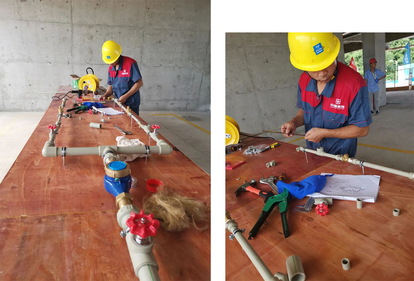 本次比賽從工程部的三個(gè)片區(qū)中精心選出優(yōu)秀水電工,瓦工,膩?zhàn)庸じ魅M,雜工5組,一共32支隊(duì)伍參加本次比賽。