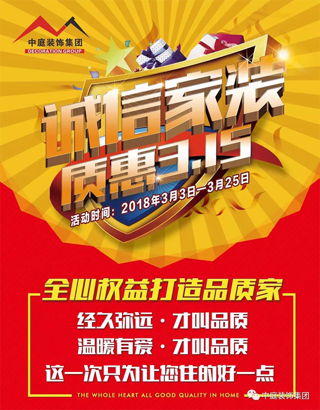 誠信家裝,品質(zhì)宣言,我宣誓:誠信中庭人,從我做起,我愿意遵守公司誠信承諾,以客戶滿意為第一原則,讓百萬家庭享受快樂裝修。誠信315,在消費陽光下,中庭裝飾集團向您鄭重承諾: