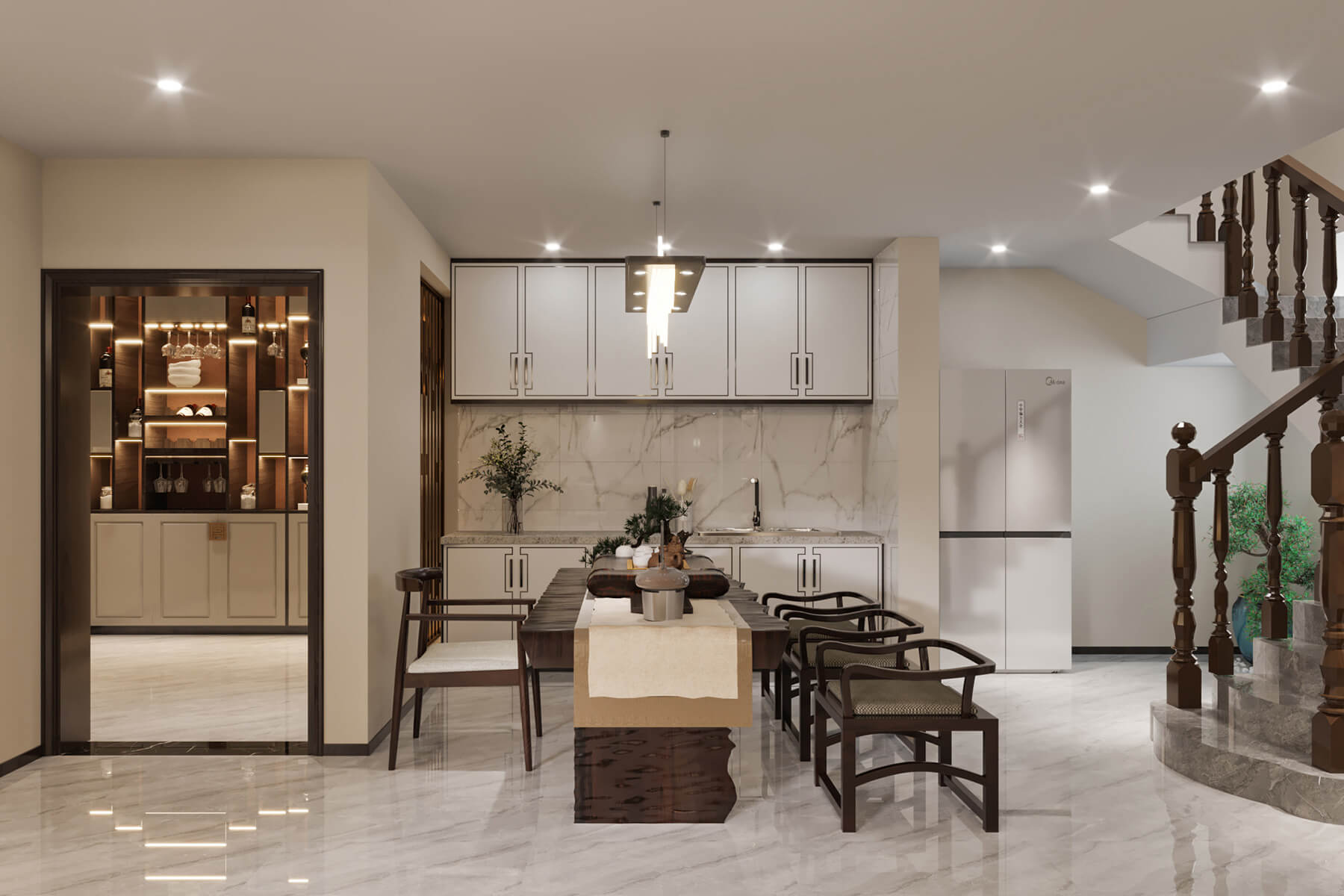 本案總面積136㎡,整體采用新中式風格設計。沿襲傳統(tǒng)江南風情,蘊藏著悠然詩意的傳統(tǒng)文化在空間中娓娓道來。東方的風韻與藝術的雅致,以簡練的手筆,營建清寧澄凈的氣質(zhì)與芳華。