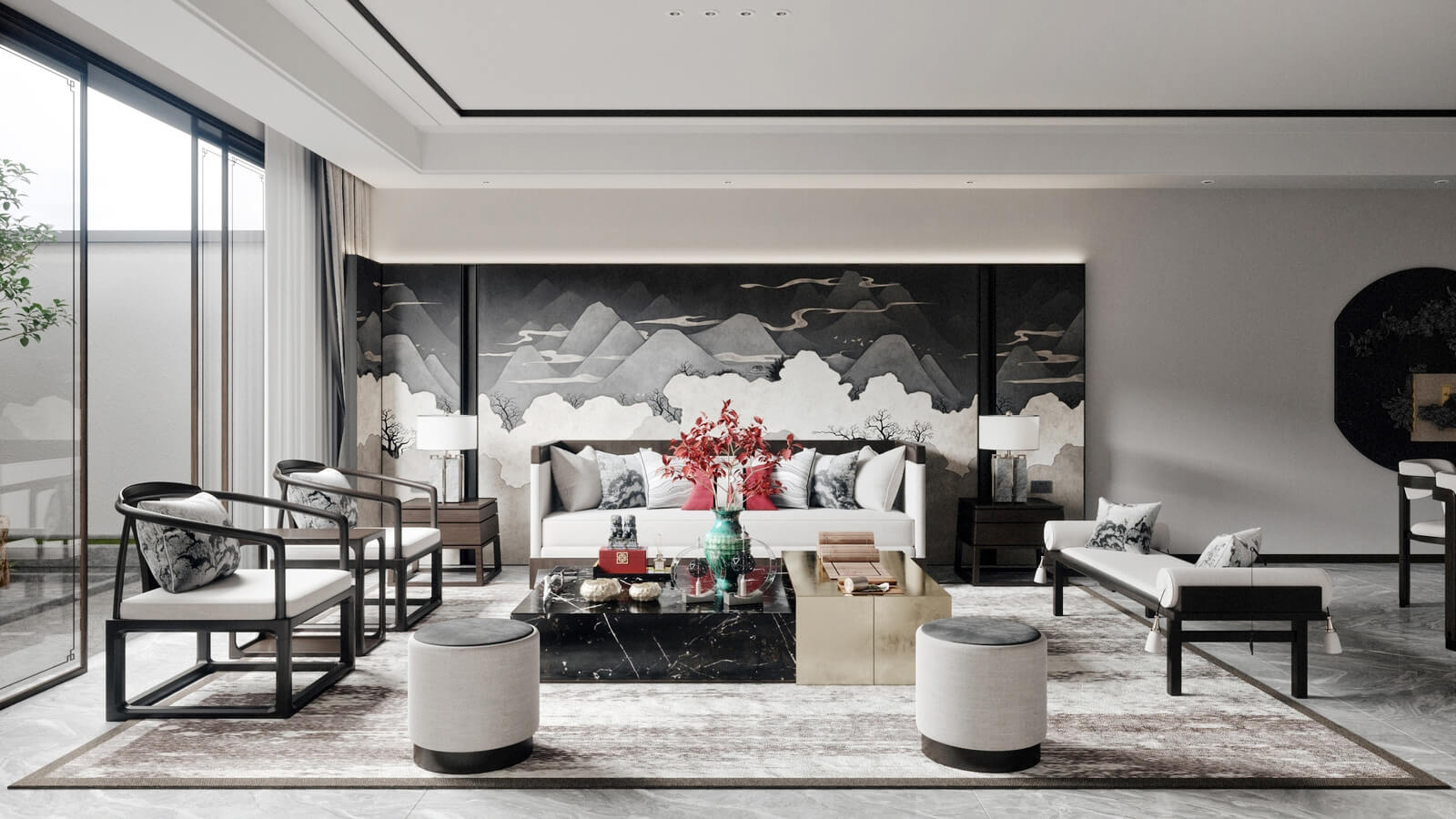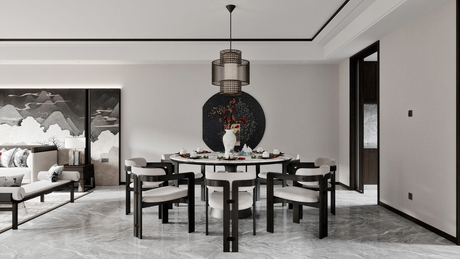 設(shè)計(jì)師打破了人們對(duì)傳統(tǒng)中式風(fēng)格的固有觀(guān)念,加入了許多現(xiàn)代化的設(shè)計(jì)元素。其中,中國(guó)風(fēng)味一點(diǎn)兒也沒(méi)少。山水畫(huà),瓷器,深色桌椅,這些富含古典韻味的裝飾,完美地與現(xiàn)代化的空間融為一體,體現(xiàn)出靜謐的美感。
