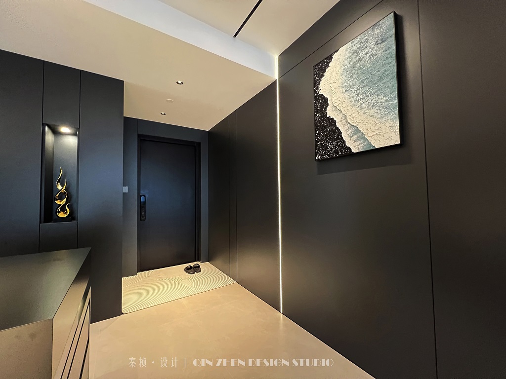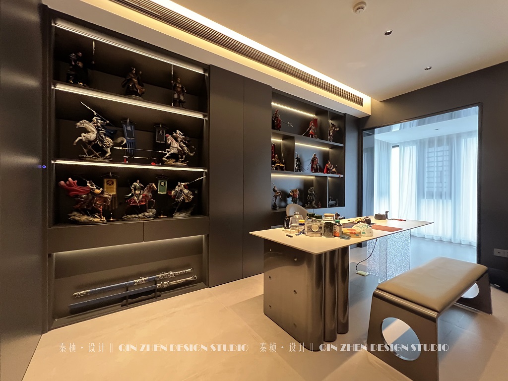 戶型改造: ◆原戶型的5房直接改成2房,入戶封閉廚房拆除; ◆將原有的老人房拆除做成半開放式書房+茶室; ◆把次臥做隱藏門隱秘空間、打通陽臺; ◆原有的封閉式廚房做成開放式廚房; ◆靠近主臥的次臥打通,做成衣帽間;