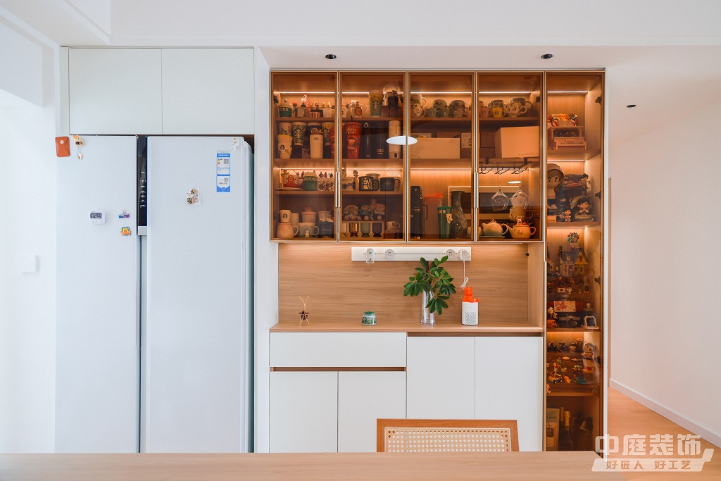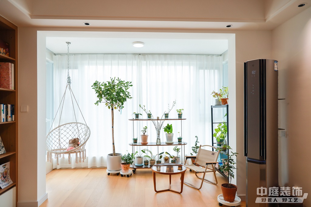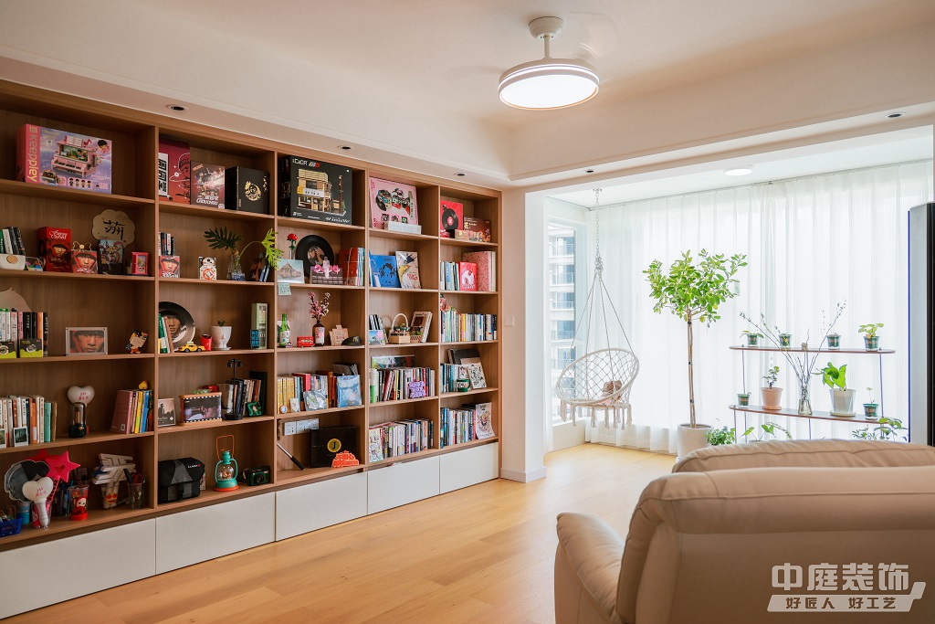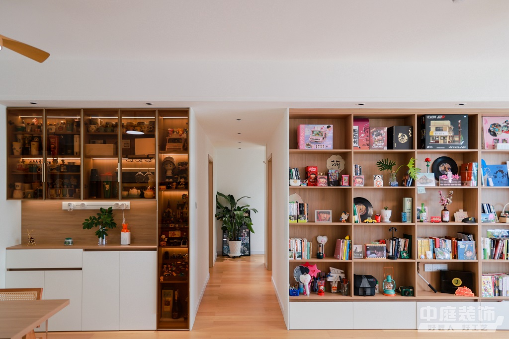 仿佛步入了一個自然與簡約交織的溫馨空間。淺色調(diào)的木質(zhì)地板營造出一種質(zhì)樸而不失高雅的氛圍??蛷d中央,去客廳化的設(shè)計,一排原木色到頂書架擺滿精心挑選的物件和書籍,一進(jìn)門就能感受家的溫暖。