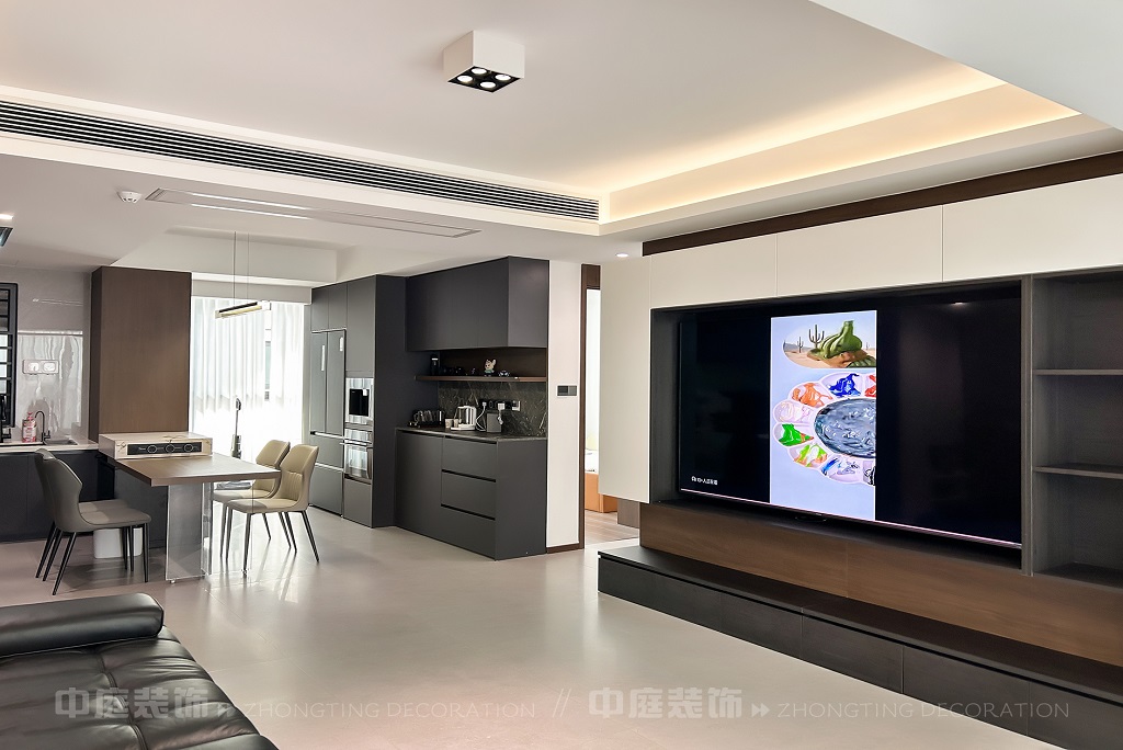 客廳以現(xiàn)代黑白灰極簡(jiǎn)風(fēng)格為核心,大面積白紗簾引入自然光線,黑色皮質(zhì)沙發(fā)質(zhì)感高級(jí)。開(kāi)放式布局,深灰櫥柜與木質(zhì)餐桌形成材質(zhì)對(duì)比,線性吊燈提升精致感,功能與美學(xué)兼具,營(yíng)造現(xiàn)代簡(jiǎn)約的烹飪用餐氛圍。輕柔窗簾與柔和燈光,打造靜謐休息空間。精致的材質(zhì)選擇與合理的功能規(guī)劃,詮釋了“少即是多”的現(xiàn)代簡(jiǎn)約居住美學(xué)。