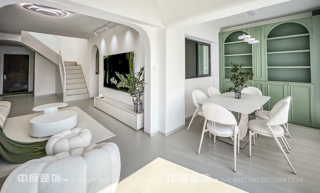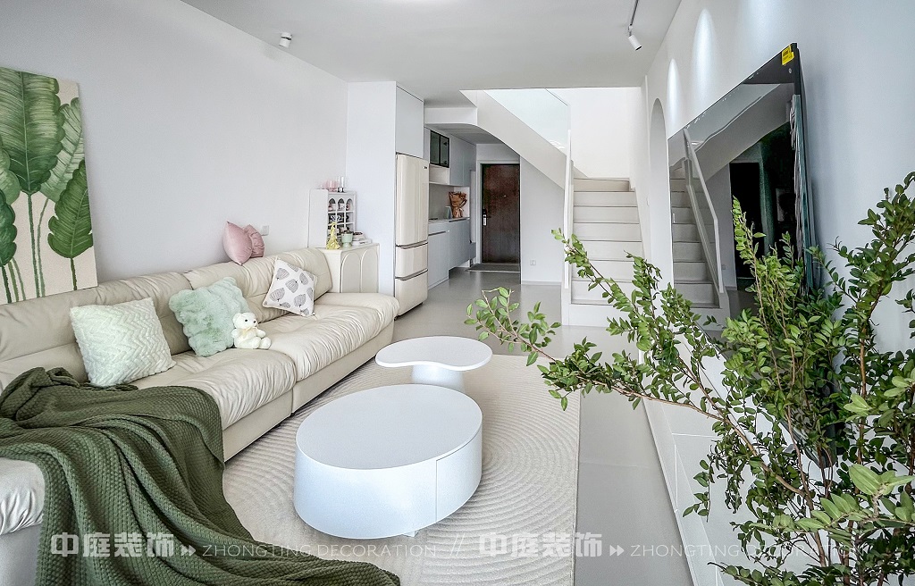 這一套綠意盎然的奶油風格好似把森林搬進了家,軟乎乎的奶白沙發(fā)搭配苔蘚綠毛毯,抱枕選了粉綠撞色,往上面一躺,一天的疲憊都被融化了!圓潤的白色組合茶幾,顏值與實用并存,氛圍感直接拉滿。墻面掛畫大葉綠植藝術畫,角落擺放鮮活綠植,將自然綠意融入空間。