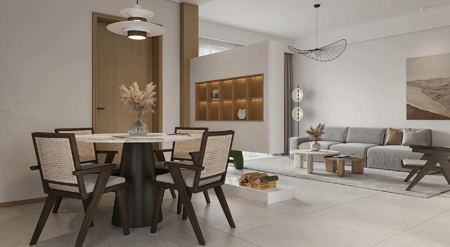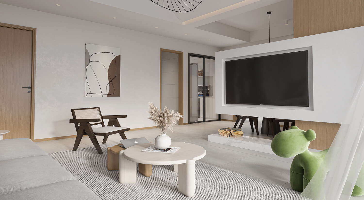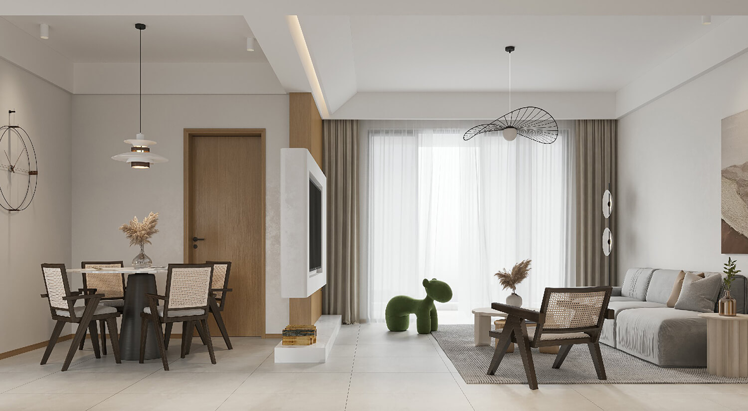 本案屬于現(xiàn)代簡約風格??蛷d采用無主燈設(shè)計,更具簡約時尚感。客餐廳布局合理,客餐廳通鋪淺灰色瓷磚。使空間更加開闊明亮,增加空間美觀度。