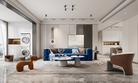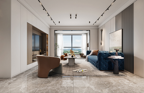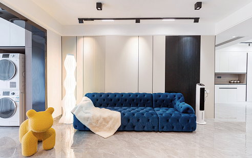 使用更親近自然的棉、麻、木搭配黑、棕、白、灰色,在裝飾上極度的克制,給人高品質(zhì),舒服的感受。削弱復(fù)雜造型和色彩對人情緒的影響,反而產(chǎn)生了治愈的力量??巳R因藍沙發(fā)的點睛之筆,顯得整個空間更加自信,給人傳遞高級的視覺感受。