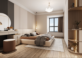竹炭飾面護墻板做背景,是大空間設(shè)計元素在小空間的延續(xù)。主臥沒有做過多的造型,大量留白,通過軟裝設(shè)計師的巧手來營造氛圍,利用不同色系與材質(zhì)對比組合形成精致豐盈的裝飾效果,風(fēng)吹簾動,琉光行云,主臥釋放著樂且晏如的溫柔情緒