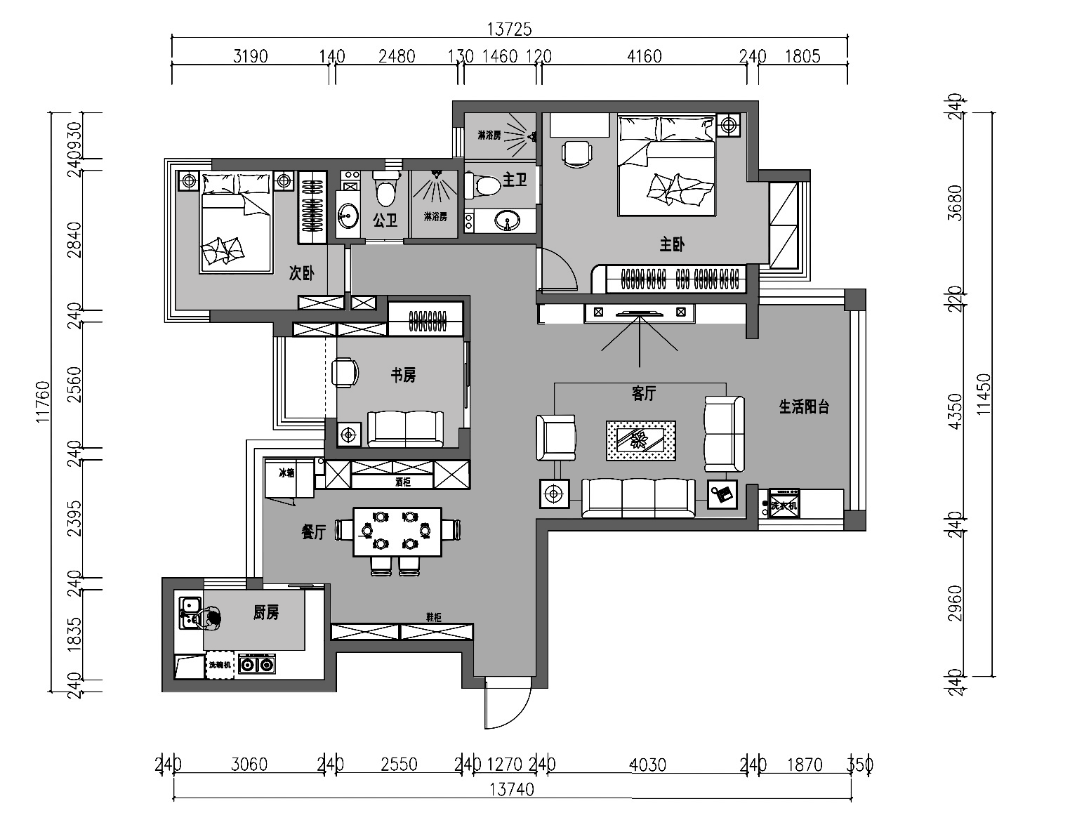 原始戶型雖為雙陽臺設(shè)計,但由于S形的客餐廳錯位結(jié)構(gòu),使得整個空間無論是采光、通風(fēng)上,都不算是非常理想。兩個次臥大小分別僅為7.4平米和7平米,給人的體感上顯得非常擁促。
