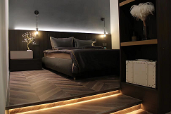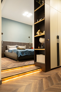 在臥室的臺階處制作地臺,加燈帶氛圍烘托氣氛,做柜子有效隔開衣帽間獨立空間。