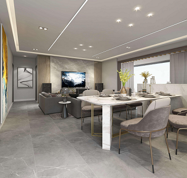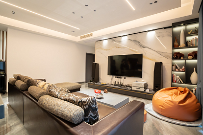 電視背景墻選用木飾面及巖板,質感柔和,地面用同色系深色些的瓷磚,讓空間更有層次感。
