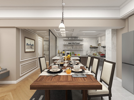 開(kāi)放式廚房和餐廳可以共享操作,互不干擾,又可以加強(qiáng)家人之間的互動(dòng)性提高家庭的幸福感。