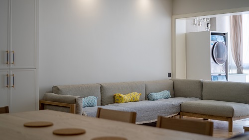4.客廳:將景觀陽(yáng)臺(tái)納入客廳空間,視線開(kāi)闊,到頂?shù)膬?chǔ)物柜滿足收納需求且有足夠的展示空間。